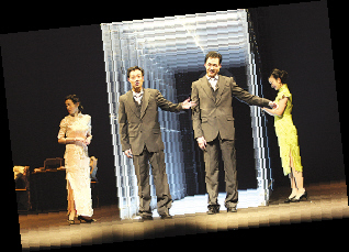 如果你中途進(jìn)場,舞臺(tái)上8個(gè)人走來走去可能會(huì)讓你有點(diǎn)摸不著頭腦。穿著一樣的西裝背心和西褲的兩個(gè)振保,辛柏青代表世俗的、不得不扮給社會(huì)看的表象的振保,而高虎則代表內(nèi)心的那個(gè)不時(shí)想出軌、不時(shí)與自己斗爭的內(nèi)心的振保。而紅玫瑰和白玫瑰也都有兩個(gè),同樣一個(gè)是內(nèi)心想做的、一個(gè)是表象必須做的:你可以看到秦海璐飾演的紅玫瑰在與振保調(diào)情,而舞臺(tái)后方另一個(gè)與她同樣打扮的紅玫瑰還在與丈夫王士洪悠閑地聽著唱片;你可以看到胡靖釩飾演的白玫瑰在囑咐丈夫振!俺鲩T記得帶傘”,而在她身后另一個(gè)白玫瑰正在與小裁縫曖昧地聊天……一開始還真有點(diǎn)不適應(yīng),可看進(jìn)去卻覺得這種形式非常新奇有趣。經(jīng)常是,2個(gè)振保、4朵玫瑰,加上王士洪和小裁縫8個(gè)人一起出現(xiàn)在舞臺(tái)上,一起說話、一起行動(dòng),奇怪的是,作為觀眾的你并不覺得混亂。舞臺(tái)形式也很有趣,舞臺(tái)中央一道玻璃通道,2個(gè)振保一同從幕后走進(jìn)通道,然后分別打開通道兩側(cè)的門,一個(gè)走進(jìn)現(xiàn)實(shí)生活中與白玫瑰的家,另一個(gè)走進(jìn)另一側(cè)與紅玫瑰的回憶。