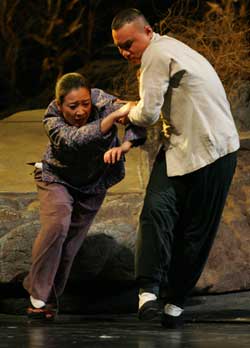資料圖:著名演員梁冠華以一位外號(hào)“狗兒爺”的形象演出話劇《狗兒爺涅槃》。 中新社發(fā) 滿會(huì)喬# 攝