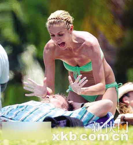 超模海蒂·克拉姆日前帶著雙親和孩子們到墨西哥海邊度假。盡管已為人母,但海蒂在雙親面前仍然如孩子般調(diào)皮,父親躺在海灘上休息,她趁其不備,張開雙手欲嚇父親,俯身時卻被狗仔隊拍到她小腹上層疊的肉圈。