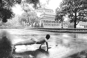 區(qū)志航:我剛才說(shuō)了,要引起大家的思考。那我必然要選擇中國(guó)最具代表性的城市,然后要選擇這個(gè)城市最具代表性的景觀,當(dāng)人們看見一個(gè)赤裸裸的人在這個(gè)景觀前做著這樣的行為,就會(huì)立馬聯(lián)想、思考到很多東西。全國(guó)我只選了北京、上海、廣州、香港四個(gè)重要的城市,挑選了這四個(gè)城市的主要標(biāo)志性建筑,形成一個(gè)主題,我不想無(wú)目的的隨便拍,那樣整個(gè)作品的精神就分散了。本來(lái)廣州我還想拍海珠廣場(chǎng),但覺得影響力太小了,故此改拍更雄偉的中山紀(jì)念堂;本來(lái)想在北京天安門前面拍,可是那的保安太嚴(yán)密了,我不想被抓。所以說(shuō)每一處拍的地方都是經(jīng)過(guò)深思熟慮的。