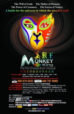 定位為搖滾動(dòng)作音樂(lè)劇,又要與中國(guó)傳統(tǒng)音樂(lè)元素相結(jié)合,羅啟仁說(shuō)到音樂(lè)上的特點(diǎn)很興奮:“《美猴王》的音樂(lè)創(chuàng)作者周佼佼很年輕,作為奧運(yùn)會(huì)期間首演的大劇用一位學(xué)生級(jí)的作曲,很多人不能認(rèn)同。我不認(rèn)為年輕不行,我有我的勇氣。因?yàn)閾u滾是年輕人的范圍,如果找一位很大年紀(jì)的人來(lái)弄搖滾,是‘搖’不出來(lái)的。音樂(lè)是中國(guó)類型的搖滾,是特別新鮮的,西方都沒(méi)有這類的作品。吉他和琵琶的二重奏、與古箏的二重奏等,還有美聲的唱法,大概十首歌,聽(tīng)起來(lái)很不錯(cuò)!