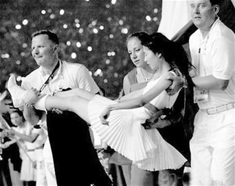 值得一提的是,當(dāng)晚,有位白衣姑娘因透支體力而昏厥。在網(wǎng)上,一張照片記錄了這一幕:一位白衣MM不省人事,左手因抽筋痙攣而僵硬。讓人感動的是,這位姑娘暈倒在地后,第一時間抱起她的,是一位美麗的外國女運動員,兩旁還有兩位身穿白衣的外籍工作人員,一人托住她的腳,一人扶住她的頭,面露焦急,奔跑著,將姑娘送下場。這一幕,感動了無數(shù)網(wǎng)友,紛紛感謝這3位外國友人的熱心,并急切地搜索著他們的資料!罢嬲\的國際友誼啊!為這樣的和諧、友好鼓掌!”有網(wǎng)友在網(wǎng)上發(fā)了無數(shù)個“謝謝”來表達(dá)無法表達(dá)的謝意。