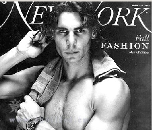 奧運會網(wǎng)球男子單打新科冠軍納達爾成為時尚界的新寵。他赤裸上身大展肌肉,成為即將于本月25日出版的美國時尚雜志《紐約》雜志男女雙刊男子部分的封面人物,與他對應(yīng)的女子部分的封面人物則是前名?死锼沟佟げ剂挚死