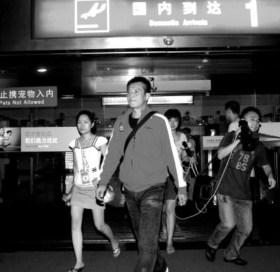 “靖哥哥”黃日華是從哈爾濱飛來重慶的,飛機比預計時間早到了10多分鐘,但人群漸漸散去都還未見他的蹤影。30分鐘之后,身穿紅色運動服、牛仔褲,白色球鞋的黃日華出現在到達大廳,沒有戴帽子和墨鏡,小麥膚色的“靖哥哥”顯得很低調。有記者試圖上前訪問,酷酷的黃日華只顧向前走并不作答。期間,有不少路人認出了他,都紛紛掏出手機猛拍,更有女生冒雨追趕希望能跟他合影。