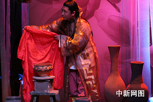 該劇是以發(fā)生在澠池仰韶村一個(gè)陶藝世家的制陶故事為背景,通過秦王的兒子邂逅彩陶女所產(chǎn)生的愛情故事為主線,整個(gè)劇情起伏跌宕,臺(tái)詞風(fēng)趣幽默,令觀眾沉醉在悲喜交加的人物命運(yùn)中。影視戲劇演員張成曉勇的精彩演繹博得了全場(chǎng)觀眾的陣陣掌聲和喝彩。當(dāng)絢麗的舞臺(tái)燈光變幻出滿場(chǎng)旋轉(zhuǎn)的來自澠池縣仰韶村彩陶坊的精美彩陶時(shí),把整個(gè)劇情推向了高潮,令在場(chǎng)的首都觀眾驚嘆不已。樸拙俊美的仰韶彩陶的確是在金黃的季節(jié)里給首都的觀眾上了一道視覺文化大餐。