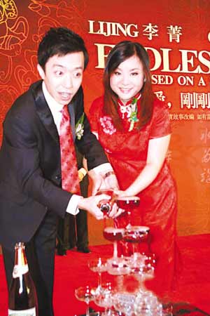 昨早10時,郭德綱、于謙、小何、春妮等應(yīng)邀前來。郭德綱和于謙默契地以“白T恤蹭花了”的服裝出現(xiàn),頗為喜氣。他更在留言板上題詞“真是太刺激了!”當(dāng)天婚宴的主持由郭德綱擔(dān)當(dāng),他表示自己很少主持此類婚宴,但臺上與新郎李菁一唱一和的搭檔風(fēng)趣幽默,令在場所有嘉賓開懷不已。他更形容新娘“五大三粗”語含深意,據(jù)知情人透露,新娘極有可能已經(jīng)懷孕。
