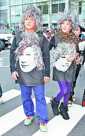 胡瓜、藍(lán)心湄響應(yīng)環(huán)保穿起了由報(bào)紙做成的環(huán)保衣服。