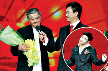 趙本山和小沈陽的春晚小品《不差錢》,昨晚捧得了小品類觀眾最喜愛的節(jié)目一等獎,趙本山在得獎感言時表示:“我最興奮的是,我兩個學(xué)生終于能站在這個舞臺上了,這讓我非常高興!毕噍^之下,倒是小沈陽的得獎感言很是簡單,只有“感覺很美”四個字。按照慣例,獲獎嘉賓要表演節(jié)目,而趙本山今年首次坐鎮(zhèn)觀眾席,讓徒弟小沈陽獨自撐場面,“咱們這幾個誰來都容易被哄下臺去,還是小沈陽來吧!庇谑,小沈陽獻(xiàn)唱了拿手曲目《大!罚褟堄晟穆曇裟7碌梦┟钗┬,贏得觀眾陣陣掌聲。一曲唱罷,下臺前還摔了一跤,觀眾們頓時笑翻。而董卿立即上臺給他圓場:“小沈陽是在逗咱們,其實他到哪表演都摔!