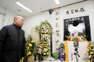 在張文順先生的靈堂內(nèi),記者發(fā)現(xiàn),除了郭德綱為張文順老先生題寫的“東海風(fēng)氣悲公一去空余恨;西山落日哀哉兩字不堪聞,橫批:氍毹英豪”的挽聯(lián)外,墻上還有一幅郭德綱親筆書寫的“一陣風(fēng)留下了千古遺恨”的題字。當(dāng)被問及這些文字的意義時,郭德綱表示,只是表達(dá)了自己的一種心情,據(jù)介紹,“氍毹”(qúshū)是古代人對于舞臺的另一種稱呼,張文順在表演中一向平穩(wěn)樸實,又整理出眾多珍貴的單口相聲,郭德綱認(rèn)為,稱張文順是“氍毹英豪”毫不過分。與春節(jié)期間在天津演出時的狀態(tài)相比,郭德綱瘦了不少,不過從精神狀態(tài)來看,昨日郭德綱的情緒已經(jīng)平復(fù)了很多,神情上雖然仍是一臉落寞,但他向記者表示自己已經(jīng)平靜下來了。