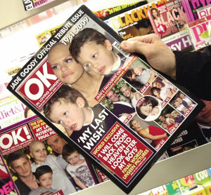 視臺(tái)播出。她于2月22日和男友杰克·特威德舉行婚禮。據(jù)報(bào)道婚禮報(bào)道權(quán)以100萬(wàn)英鎊(約合140萬(wàn)美元)價(jià)格出售。她還通過(guò)接受專訪、撰寫“抗癌日記”等形式獲取報(bào)酬,目的是為了讓兩個(gè)年幼的兒子未來(lái)更有保障。