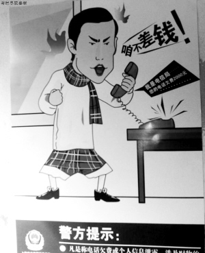 昨日,記者在一論壇看到,小沈陽(yáng)《不差錢》的形象上了警方發(fā)出的告示,告示上的“小沈陽(yáng)”怒吼“咱不差錢”。警方提示語(yǔ)稱:“凡是稱電話欠費(fèi)或個(gè)人信息泄露,涉及財(cái)物的陌生來(lái)電一律不要理睬!如有疑問(wèn)請(qǐng)撥打110!”而落款則是上海市公安局某分局。記者 楊萬(wàn)亮