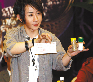 隨后,劉謙開始為現(xiàn)場的媒體記者表演了一個(gè)小魔術(shù),只見他拿出了鹽與胡椒粉,將其混在一起,并脫掉了自己手上所有的戒指,把袖子也卷了起來,在瞬時(shí)把鹽和胡椒粉分開了。正當(dāng)大家驚呼劉謙水平高時(shí),劉謙突然自己給這個(gè)魔術(shù)解密!斑@個(gè)魔術(shù)其實(shí)已經(jīng)流傳了100多年了,這個(gè)胡椒粉其實(shí)是鐵砂,我手中藏了一塊磁鐵,只要用磁鐵一吸,鐵砂就從鹽中分離出來了。不過,我在5月8日首演時(shí),將會把真正的混在一起的鹽與胡椒粉在10秒之內(nèi)分開,這才是我最新的魔術(shù)!