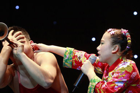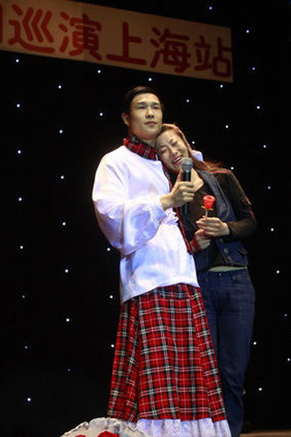 中新網4月27日電 《劉老根大舞臺》小沈陽笑轉2009,全國巡演上海站昨晚(26日)在上海大舞臺(上海體育館)拉開序幕,王金龍和毛毛(丫蛋)夫婦同臺獻藝,毛毛上演了野蠻老婆的戲碼。丫蛋以野蠻的招數著稱,這次剛剛新婚不久的夫妻二人,給上海的觀眾朋友們來了個以外驚喜。觀眾的歡呼聲讓整個體育館達到了高潮。