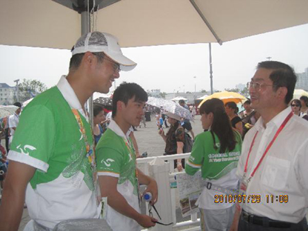 在與志愿者座談中,崔明華指出,由14位華僑華人組成的世博志愿者隊伍,代表了4500萬海外華僑華人。這支隊伍是世博園區(qū)唯一的一支海外僑界志愿者隊伍,凝聚著海外僑胞的期望和僑務(wù)部門的信任,他希望每位同學(xué)珍惜這次來祖籍國擔(dān)當(dāng)世博志愿者的機會,更多地了解中國、了解上海、了解世界,把自己在世博服務(wù)過程中的美好感受記錄下來,帶回去與家人和同學(xué)們分享。來自法國的志愿者張悅,在上海一切都好,父母很放心,來自8個國家和地區(qū)的同學(xué)們很團(tuán)結(jié),他們一定會努力完成為期兩周的志愿者服務(wù)。