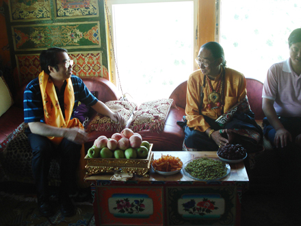 許又聲與朗扎活佛親切交流。朗扎·依加拿布是回國定居藏胞,朗扎覺姆寺活佛。1958年到印度朝佛,幾年后到瑞士,1978年回國定居。