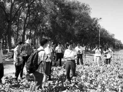 9月4日,參加“文化中國——海外華文媒體新疆行”的媒體代表到石河子采訪。石河子市外僑辦主任高輿陶(中)向媒體團成員介紹當?shù)胤N植棉花的情況!拔幕袊M馊A文媒體新疆行”采訪活動由中國國務(wù)院僑辦和新疆維吾爾自治區(qū)僑辦主辦,有來自美國、加拿大、法國等23個國家和地區(qū)的40家華文報紙、雜志、電視臺參加。(張紅攝)