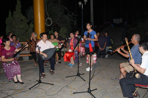 在金川前的小廣場上,文藝晚會依舊豐富多彩,激情動感的舞蹈、詼諧幽默的小品、悠揚(yáng)美妙的器樂彈唱贏來了一波又一波的掌聲和笑聲。而在秋中湖旁的小涼亭里,有支特別的樂隊(duì)也吸引了不少老師學(xué)生駐足聆聽,他們是由華僑大學(xué)退休教職工組成的南音演奏社。老人家們彈著琵琶,吹著筒蕭,拉著二弦三弦,吟唱一首又一首韻味悠長的南音樂曲。來自橋南小學(xué)的幾名學(xué)生也來助陣,老少合作的表演別樣溫馨。今年已經(jīng)七十一歲的張彬彬女士表示,他們同是喜愛南音的老職工,她退休以來已經(jīng)學(xué)了七八年的南音了,能把南音這一傳統(tǒng)文化傳播給更多人,他們都很開心。