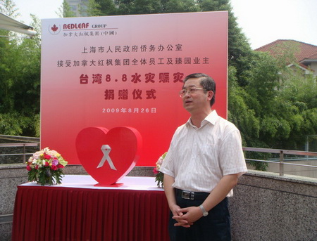 8月26日上午,上海市政府僑辦接受加拿大紅楓集團向臺灣受災地區(qū)捐贈儀式在臻園別墅舉行。加拿大紅楓集團董事長周正寬先生、馬絢華女士代表集團,通過上海市政府僑辦向臺灣受災地區(qū)捐款人民幣30萬元。副總經(jīng)理丁道恒等代表全體員工捐款人民幣1.7余萬元。臻園別墅業(yè)主也在活動現(xiàn)場進行了捐款。上海市政府僑辦主任崔明華出席活動并講話。