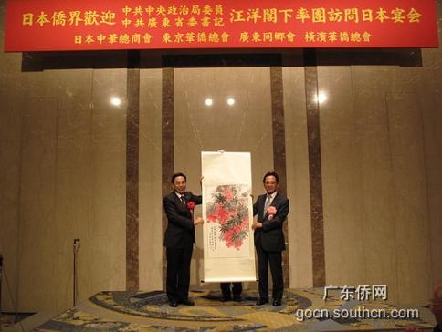日本中華總商會(huì)會(huì)長嚴(yán)浩代表宴會(huì)主辦單位向廣東省代表團(tuán)贈(zèng)送了紀(jì)念品,廣東省委常委、廣州市委書記朱小丹向宴會(huì)主辦單位回贈(zèng)了國畫《紅荔》。廣東省外辦、省外經(jīng)貿(mào)廳等省直有關(guān)單位及有關(guān)市領(lǐng)導(dǎo)也出席了當(dāng)晚的歡迎晚宴。(陳雪婷)