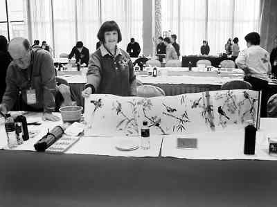 國際友人對筆會也是情有獨(dú)鐘。來自澳大利亞的博理查和宣月,已跟中國老師林伯墀學(xué)中國畫達(dá)10年之久。林老師讓宣月不但學(xué)中國畫,還要學(xué)更多的中國文化。她這次來想通過參與交流,開闊視野,取長補(bǔ)短,使自己的繪畫藝術(shù)再上一層樓。她還高興地展示了自創(chuàng)的花鳥畫集,并和博理查向藝術(shù)節(jié)敬獻(xiàn)了現(xiàn)場創(chuàng)作的“鮮花綻放圖”和“袋鼠翹首觀望圖”。來自美國西雅圖的畫家,把自己創(chuàng)作的一幅長達(dá)十幾米、影響類似中國《清明上河圖》的《西雅圖美景》大畫贈給了華人文化藝術(shù)節(jié)組委會,感動了在場的海內(nèi)外僑胞。