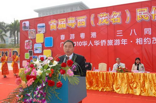 中新網(wǎng)2月24日電 據(jù)茂名外僑局消息,2月23日,廣東省茂名市在市文化廣場(chǎng)隆重舉行首屆粵西(茂名)民俗風(fēng)情旅游節(jié),同時(shí)啟動(dòng)“春游粵港·三八同樂(lè)”和“廣東2010年華人華僑旅游年·相約茂名”活動(dòng)。茂名市人大常委會(huì)常務(wù)副主任宋壽金,廣東省僑辦副主任林琳,廣東省旅游局副局長(zhǎng)王志紅,茂名市市委常委、副市長(zhǎng)林日娣,市政協(xié)副主席章寧,茂名市外事僑務(wù)局局長(zhǎng)梁紅健及美國(guó)茂名同鄉(xiāng)會(huì)會(huì)長(zhǎng)郭嚴(yán)芳先生等領(lǐng)導(dǎo)和各界來(lái)賓約600人出席了活動(dòng)。