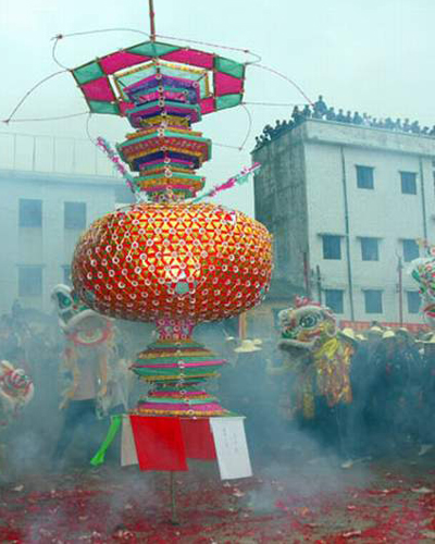 “泮村燈會(huì)”始于明朝英宗天頤八年(公元1464年,農(nóng)歷甲申年)正月十三日,至今500多年。每年農(nóng)歷正月十三,開平市水口鎮(zhèn)泮村舉行舞燈盛會(huì),今年當(dāng)?shù)赜瓉砹说谑粚梦锜羰?huì)。當(dāng)天上午,3個(gè)三米多高的大花燈,以羅傘彩旗開路,龍獅共舞,鞭炮齊鳴,巡游于泮村48條自然村,全過程包括扎燈、送燈、起燈、舞燈、打燈,故擇其名為“泮村燈會(huì)”。