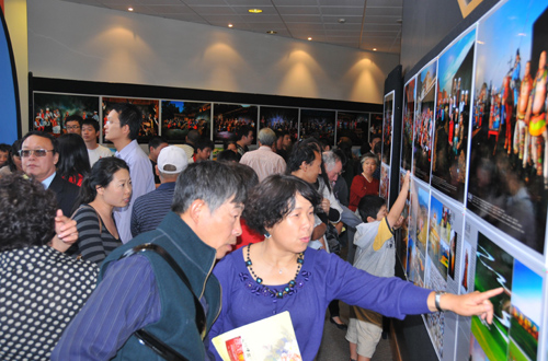 演出前,“文化中國•四海同春”大洋洲藝術團團長、國務院僑辦副主任趙陽在劇場外大廳為《中華民族全家!穲D片展剪彩。一幅幅圖片展示著中國56個民族多姿多彩的文化生活。基督城僑胞們或駐足欣賞,或興奮地向周邊朋友細說自己在中國的所見所聞。