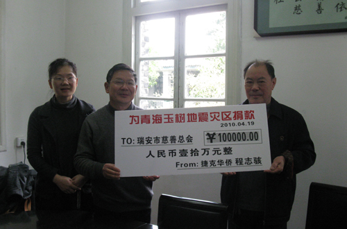 中新網(wǎng)4月20日電 據(jù)瑞安市僑聯(lián)消息,青海玉樹(shù)縣的地震震撼了每個(gè)中國(guó)人,也揪緊了千里之外瑞安僑胞的心。4月19日凌晨5時(shí)多,浙江省瑞安市寧益鄉(xiāng)僑聯(lián)主席吳勝運(yùn)接到瑞安籍捷克僑領(lǐng)程志駭?shù)碾娫?huà),說(shuō)自己有一筆10萬(wàn)元的玉樹(shù)賑災(zāi)捐款將由他的岳父葉余積轉(zhuǎn)交給瑞安市僑聯(lián)。