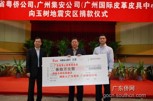 4月24日上午,簡樸熱烈的捐款儀式在廣東省僑辦二樓禮堂舉行。廣東省粵僑企業(yè)總公司黨委書記、總經(jīng)理詹奕群和廣州溫州商會會長、廣州集安投資有限公司董事長朱清國,向廣東省僑辦副主任、省僑心慈善基金會榮譽(yù)主席朱爾武遞交了30萬元救災(zāi)捐款支票。廣東省僑辦副巡視員、省僑心慈善基金會監(jiān)事長董華民主持捐贈儀式并講話,他充分肯定了粵僑企業(yè)總公司、集安投資有限公司履行社會責(zé)任,積極參與賑災(zāi)濟(jì)困,為國分憂、為民紓難的善舉。據(jù)悉,這筆善款將經(jīng)由廣東省慈善總會盡快匯往玉樹災(zāi)區(qū)。