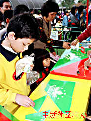 一名兒童在"喜迎澳門回歸,共創(chuàng)美好明天"園游會(huì)上認(rèn)真地拼裝澳門特區(qū)區(qū)旗圖案。澳門為紀(jì)念澳門基本法頒布六周年,于二十八日開始舉行系列活動(dòng),以增強(qiáng)人們的回歸意識(shí)。