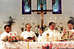 圖片說(shuō)明: 澳門(mén)教區(qū)大主教林家駿(右二)主持圣誕子夜彌撒。