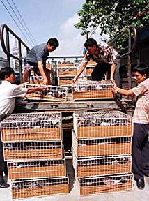 象征1999年的1999只信鴿將于九月九日在澳門的大三巴牌坊前放飛返回廣州。這項(xiàng)名為“信鴿競翔報(bào)歸訊”的活動(dòng),將揭開九月十一日澳門回歸祖國倒計(jì)時(shí)一百天紀(jì)念活動(dòng)的序幕。圖為廣州市信鴿協(xié)會(huì)正將征集的信鴿運(yùn)往澳門。