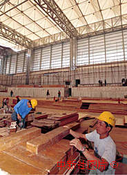 澳門(mén)政權(quán)移交大典場(chǎng)館內(nèi)部工程進(jìn)行中,施工人員正在裝飾主席臺(tái)與觀禮臺(tái)。