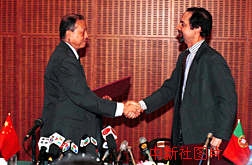 中新社傳真 毛建軍 攝 持續(xù)三天的中葡聯(lián)合聯(lián)絡(luò)小組最后一次全體會(huì)議(第三十七次會(huì)議)十一日在澳門(mén)結(jié)束。雙方對(duì)聯(lián)絡(luò)小組十二年來(lái)進(jìn)行的工作進(jìn)行了總結(jié),對(duì)聯(lián)絡(luò)小組所取得的成果表示滿(mǎn)意。圖為中方組長(zhǎng)韓肇康(左)與葡方組長(zhǎng)賈安棟簽署會(huì)談紀(jì)要。 |