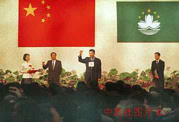 澳門特區(qū)政府在成立首日舉行招待會(huì),首任行政長官何厚鏵向國務(wù)院副總理錢其琛舉懷共賀。 中新社傳真 宗金柱攝