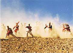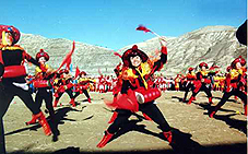 安塞位于陜北高原,那里的腰鼓歷史悠久,格調(diào)古樸。人們?cè)跉g度節(jié)日,慶祝豐收的時(shí)候,都要演出腰鼓助興,每次演出的陣容都很大,一般都有60名左右的鼓手。有時(shí)幾個(gè)隊(duì)連在一起,能拉開(kāi)一兩里路距離。腰鼓手們的裝束一律著古代將士的便服,或黃或紅包頭,素色衣服,顯得整齊壯觀。電影《黃土地》里的腰鼓手們穿著黑色,想必是為了渲染貧苦背景。實(shí)際上,過(guò)去上場(chǎng)表演的腰鼓手們,很少有穿皂服的。