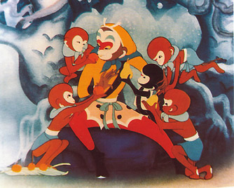 在花果山帶領(lǐng)群猴操練武藝的猴王因無稱心的武器,便去東海龍宮借寶。龍王許諾,如果猴王能拿動龍宮的定海神針--如意金箍棒,就奉送給他。但當猴王拔走寶物之后,龍王又反悔,并去天宮告狀。玉帝采納了太白金星的主張,誘騙猴王上天,封他為弼馬溫,將他軟禁起來。猴王知道受騙后,一怒之下,返回花果山,豎起"齊天大圣"的旗幟,與天宮分庭抗禮。玉帝發(fā)怒,命李天王率天兵天將捉拿猴王,結(jié)果被猴王打得大敗而歸。玉帝又接受金星的獻策,假意封猴王為"齊天大圣",命他在天宮掌管蟠桃園。一日,猴王得知王母娘娘設(shè)蟠桃宴,請了各路神仙,唯獨沒有請他。猴王火冒三丈,大鬧瑤池,打得杯盤狼藉,他獨自開懷痛飲,又吃了太上老君的九轉(zhuǎn)金丹,收羅了所有酒菜瓜果,回花果山與眾猴擺開了神仙酒會。玉帝暴怒,傾天宮之兵將,捉拿猴王。交戰(zhàn)中猴王中了太上老君的暗算,不幸被擒。老君將他送進煉丹爐,結(jié)果不但沒有燒死,反使猴王更加神力無比。于是猴王奮起反擊,把天宮打得落花流水,嚇得玉帝狼狽逃跑。