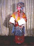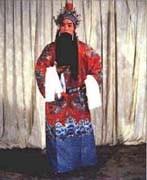 長(zhǎng)袍類 一、蟒:也稱龍袍、蟒袍,是帝、王、將、相在朝賀宴會(huì)或辦公事的時(shí)候所穿的禮服。 蟒的樣式是圓領(lǐng)、大襟、長(zhǎng)度一般拖到腳面,袖子寬闊、肥大,帶水袖,配有寬松的腰帶。 這是戲曲舞臺(tái)上扮演帝王、官員等角色使用量最多的一種蟒袍,扮演文臣武將的老生、小生、武生都可使用。在戲曲舞臺(tái)上,常由蟒袍的色彩來(lái)區(qū)別劇中任的身份、地位與年齡。蟒袍大體分為紅、明黃、杏黃、白、藍(lán)、綠、紫、粉紅、淡湖、淺米、古銅、豆沙、香色等。原箱蟒袍分為上、下五色,上五色是紅、綠、黃、白、黑色;下五色是藍(lán)、紫、粉紅、淡青和香色。明黃與杏黃是扮演皇帝、番王、王子以及齊天大圣(孫悟空)的蟒袍專用色,其他角色不得使用。 蟒的圖案主要是龍形圖案。十團(tuán)龍蟒袍在繡工上大體分為彩繡、墨繡、平金漏地繡、滿金繡、半金半彩繡、裹金繡(一金線、一彩線混合繡)等。繡法各異,色彩紛呈。不同的繡工處理與十團(tuán)龍圖案相配合,使得十團(tuán)龍蟒袍造型莊重、文雅、氣派。 穿用十團(tuán)龍蟒袍的有《甘露寺》中的劉備(因是漢中山靖王劉勝之后,漢景帝之玄孫,過(guò)江招親時(shí),穿紅色十團(tuán)龍袍)、《秦香蓮》中的陳世美(因考中狀元,被招為東床駙馬后,穿十團(tuán)龍紅色蟒袍)、《玉堂春》中的王金龍(因中頭名狀元,并被封為八府巡按,當(dāng)他會(huì)同藩司、臬司三堂會(huì)審舊時(shí)情人蘇三(玉堂春)時(shí),穿十團(tuán)龍紅色蟒袍)。 而平金繡散龍黑色蟒袍則是戲曲舞臺(tái)上扮演花臉行當(dāng)?shù)奈某、武將的官服或朝服。舞臺(tái)上常見的散龍蟒袍有黑、藍(lán)、紫、綠、杏黃等色。 散龍圖案式樣繁多,其造型比團(tuán)龍活潑、豪放。如散坐龍、散升龍、散降龍、倒掛龍、噴水龍、串水龍、串云龍、回頭龍、教子升天龍(一大龍、一小龍)、戲珠升降龍等等,均是散龍大蟒袍常用的圖案。 制作時(shí)以平金繡為主,稍加彩繡為裝飾色,配合騰云飛舞的散龍圖案,及大面積金海水為下擺(海水江芽),其造型格外莊重輝煌。 穿用人物有《秦香蓮》中的包文正(包公)、《霸王別姬》中的項(xiàng)羽(在出征前,除名演員穿黃色蟒袍外,一般都穿黑色散龍大蟒袍)等。 在戲曲舞臺(tái)上扮演地位較高而又到蒼老年齡的文職官員,其穿用的朝服有裹金繡香色蟒袍。因?yàn)閷槔夏旯賳T穿用,所以力求色彩沉穩(wěn),但又不失輝煌效果。制法上采用一線一金的"裹金繡",繡制團(tuán)龍圖案。穿用人物有《甘露寺》中的喬玄、《秦香蓮》中的王延齡等。 而彩繡豆沙色蟒袍則適合舞臺(tái)上扮演地位較高,而又不到蒼老年齡的文職官員穿用。制作時(shí)要求色彩文雅,采用團(tuán)龍圖案,用雅彩裹金繡繡制海水江芽。穿用人物如《將相和》中的藺相如。 彩繡紅色女蟒袍一般為戲曲舞臺(tái)上扮演皇后、貴妃、公主、誥命夫人(受皇帝冊(cè)封的貴婦)及掛帥女將等的朝服和公服。有時(shí)也當(dāng)作世宦人家結(jié)婚時(shí)的禮服。以紅色為主,分為彩繡與平金繡兩種。花紋多用團(tuán)鳳、散鳳和牡丹等,也可龍鳳并用。蟒袍下擺繡有"海水江芽"。女蟒袍有老式和新式兩種式樣。老式女蟒袍,外緣加寬邊;新式女蟒袍形同男蟒袍,不加外邊緣。色彩要求艷麗、輝煌,體現(xiàn)出人物的雍容華貴。 穿用人物有《貴妃醉酒》中的楊玉環(huán)(身著紅色女蟒袍到百花亭侯駕)、《大登殿》中的王寶釧(身穿紅色女蟒袍上朝見君受封為昭陽(yáng)正宮娘娘)。 老旦蟒袍多為戲曲舞臺(tái)上扮演皇太后和地位較高的誥命老夫人穿用的朝服或公服, 穿用人物有《太君辭朝》中的佘太君、《甘露寺》中孫權(quán)之母吳氏。 在戲曲舞臺(tái)上扮演番邦后妃、公主等的朝服,一般稱為女旗蟒袍。以紅色地為主,分彩繡與平金繡兩種,用團(tuán)龍、團(tuán)鳳和龍鳳等圖案。清朝服裝的女旗蟒袍不用"護(hù)領(lǐng)",用湖色硬翻領(lǐng)(類似現(xiàn)代襯衣硬領(lǐng))(領(lǐng)衣),蟒袍下擺海水無(wú)開起,旗蟒身長(zhǎng)以不露鞋為標(biāo)準(zhǔn)。 穿用人物有《四郎探母》中的鐵鏡公主(朝見蕭太后穿朝服女旗蟒袍)、《大登殿》中的代戰(zhàn)公主(上殿朝駕時(shí)穿朝服旗蟒)。 蟒中還派生出兩種袍服:一種是官衣,一種是宮衣。 1.官衣:是一般文職官員穿用的禮服。式樣同蟒。圖案是在胸前和背后繡一塊方形的圖案,官衣的色彩有紅、藍(lán)、紫、黑、古銅等。 官衣多為戲曲舞臺(tái)上扮演新科狀元、榜眼、探花等角色臨時(shí)的官服。待任命官職之后再按品級(jí)穿官服。官衣,還可作為七品縣官和新婚典禮中新郎官的吉服。 官衣顏色多為紅色、藍(lán)色、紫色、黑色和白色。黑色官衣品級(jí)最低,多為驛丞(驛站站長(zhǎng))、門官等穿用,不綴補(bǔ)子。白色為國(guó)喪孝服(不常用)。它的造型基本上是明代官服的原樣,只是加以藝術(shù)的美化和提高。 明代官衣不用素地,多用暗紋云錦織成衣料,而舞臺(tái)上大部分用素地(因云錦造價(jià)太高)。 明代官服補(bǔ)子(官員品級(jí)標(biāo)志)多在衣服的前胸、后背部直接繡成,而清代官服品級(jí)標(biāo)志是先繡成補(bǔ)子,然后再綴到天青色褂子上。 穿用人物有《御碑亭》中的王有道和柳生春(在"拜恩師"一場(chǎng)中,二人同穿大紅官