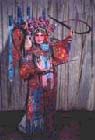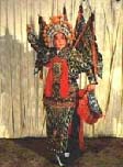 鎧甲類 古代作戰(zhàn)時,戰(zhàn)士穿的鎧甲,在京劇舞臺上叫靠,是一種美化了的舞蹈服裝?渴怯煤蜕乃鼐勛又瞥傻,上面用金、銀彩線繡滿鱗甲,看上去輝煌奪目。 靠分男靠、女靠。 男靠式樣是分前后兩扇披在肩上,還有護領(lǐng)、護肩、下甲、吊魚、靠肚子以及收緊的瘦袖。 女靠上身與男靠形式差不多,下身綴著五色繡花的飄帶,并在靠里襯著裙子,但在開打時,里面也不裙子。 靠一般分硬靠、軟靠和改良靠三種, 穿用人物有《霸王別姬》中的項羽(穿平金黑靠)、《古城會》中的關(guān)羽(穿平金綠靠)、《挑滑車》中的岳飛(穿白靠)、高寵(穿藍靠)、《連環(huán)計》中的呂布(穿粉靠)、《破洪州》中的楊宗保(穿淡湖靠)等。 戲曲舞臺上扮演女將、女統(tǒng)帥的戰(zhàn)服多采用女大靠。戲劇中使用的大靠與古代生活中的甲胄并不一樣。隨著戲曲藝術(shù)的發(fā)展,大靠的式樣和色彩逐漸增多,但距生活服裝也越來越遠。它純屬為了適應(yīng)舞臺表演的需要而設(shè)計。 建國前女大靠種類較少,只有梅蘭芳演出《穆柯寨》"花廳招親"一場戲穿用"玻璃肚子"(用玻璃棍裝飾的改良靠)。建國后女靠樣式逐漸增多,色彩不斷豐富。戲曲服裝中,女靠比男靠樣式多,而男靠比女靠色彩豐富,女靠只有粉紅、大紅、淡湖等色。新編歷史劇《楊門女將》出臺之后,出現(xiàn)了女白靠、黑靠、雪青靠、米黃靠等。 穿用人物有新編歷史劇《三請樊梨花》中的樊梨花、 軟靠:背后不插靠旗。一般是老年體弱的老將穿用。 改良靠:樣式與軟靠近似,只要腰身既緊又瘦,幾乎就象用腰帶系在身上。有的繡鱗甲,有的繡些花紋或鑲上一些鍍鎳的金屬凸片或看著晶光閃亮象圓釘子形的裝飾。 戲曲舞臺上扮演番將、武將群眾或新編歷史劇中常用改良靠。穿用人物有《雛鳳排空》中的番將韓昌、《三打陶三春》的鄭子明、《鬧龍宮》中的龍子等。 鎧是戲曲舞臺上扮演皇家殿前御林軍、隨駕儀仗隊或軍中統(tǒng)帥的服裝,又稱大鎧。色彩以紅為主,多繡平金幾何圖形紋樣。它的造型與生活中的甲胄相似?梢娝且怨糯罘b為依據(jù)的,只是做法不一。生活服裝有銅釘(有的鍍金)固定在衣服上,而舞臺上的大鎧以平金繡為主。這種穿大鎧的武士在舞臺上只是擺排場,壯聲勢,沒有武打動作。